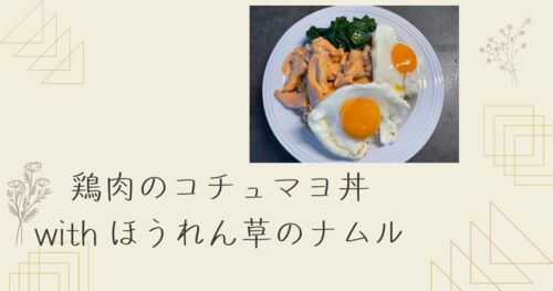 料理名:鶏肉のコチュマヨ丼 ほうれん草のナムル添え 妻コメント: "辛いけど、美味しい" ぼく:コチュマヨが辛子明太子に近い味であることを発見した! 料理上手になりたい理由 本料理のレシピ レシピ: Delish Kitchen より引用 ポイント:もも肉は合わない…